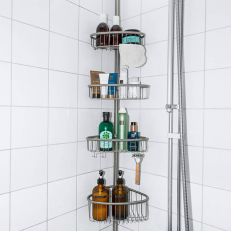 Nemt monteret hjørnehylde i rustfrit stål til badeværelset med fire praktiske kurve til dit badeværelsestilbehør. Hjørnehylden kan bruges både med eller uden badekar og er en glimrende løsning, når du ikke ønsker at bore i flisen.