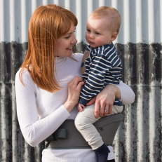 Det robuste bælte spændes om hoften med både en bred velcrostrop og et ekstra sikkerhedsspænde, der sikrer, at det er spændt ordentligt fast. Barnet sidder sikkert tæt ind til kroppen på det fremspringende sæde og du kan selv vælge hvilken side du vil bære barnet på. Siddepuden er behageligt polstret og har desuden en skridsikker overflade, der gør, at barnet sidder sikkert.