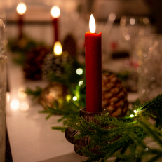 Fine batteridrevne vokslys der med et halvt udbrændt design og et varmt hvidt flimrende lys giver et realistisk indtryk. De 15 cm høje lys passer til både høje og lave lysestager og er gode til hverdagsbrug, til jul og andre højtider.
